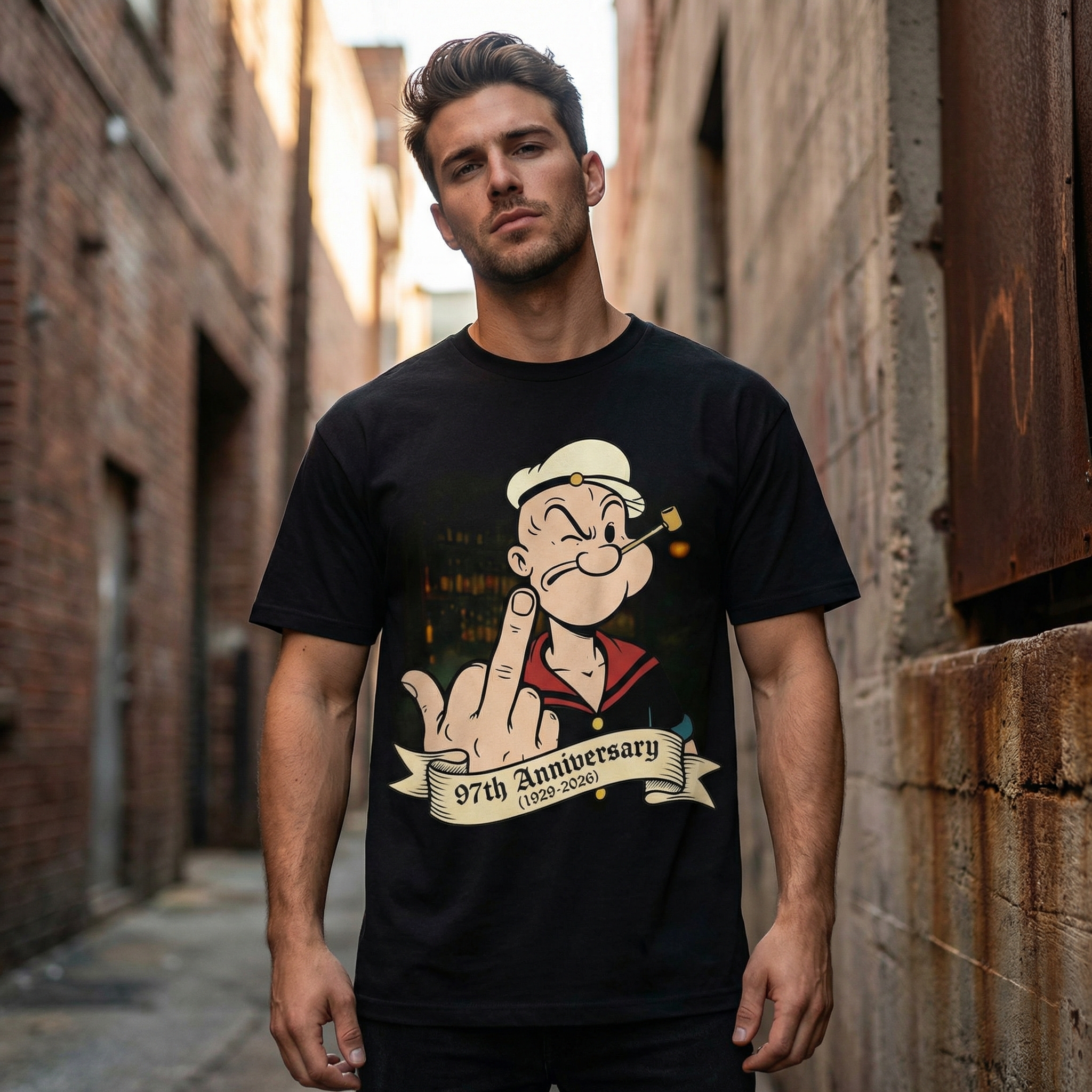 This limited-edition graphic tee celebrates 97 years of an unmistakable attitude, timeless grit, and unapologetic confidence. Inspired by one of the most iconic sailors in pop culture history, this piece isn’t just clothing — it’s a statement.