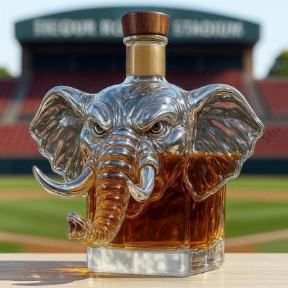 The bottle is made from high-quality clear glass, allowing the warm amber whiskey inside to show through beautifully. The elephant’s expression is intense and lifelike, with textured wrinkles, curved tusks, and realistic eyes that bring out its personality.